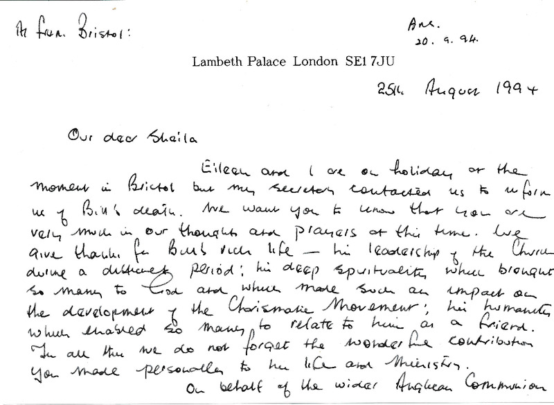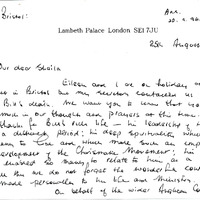 - Letter of condolences, addressed to Sheila Burnett on the death of her husband Bill Bendyshe Burnett, who died on the 23rd of August 1994.