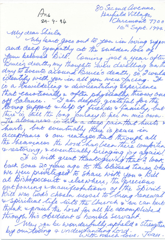 - Letter of condolences, addressed to Sheila Burnett on the death of her husband Bill Bendyshe Burnett, who died on the 23rd of August 1994.