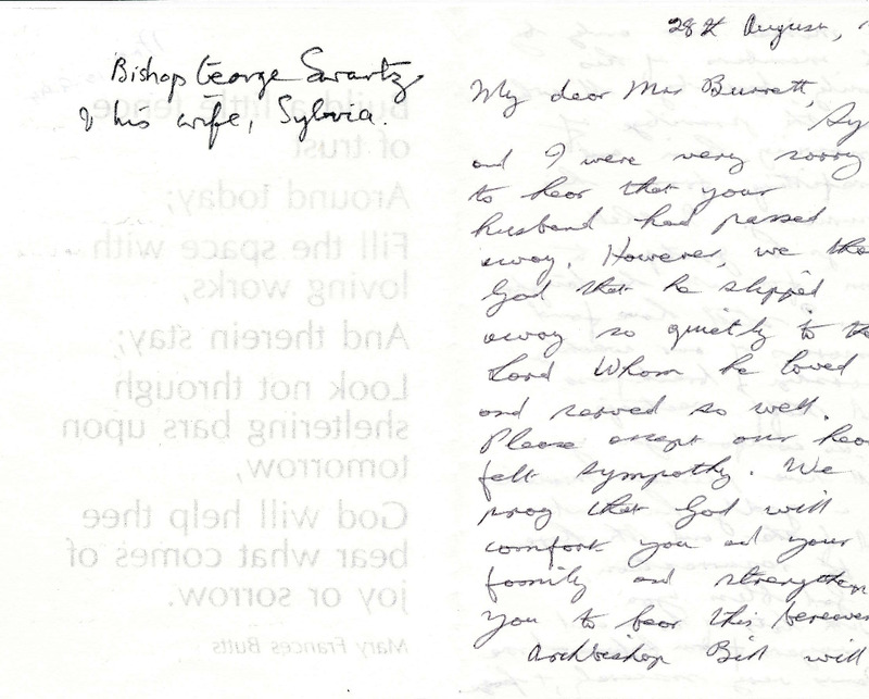 - Letter of condolences, addressed to Sheila Burnett on the death of her husband Bill Bendyshe Burnett, who died on the 23rd of August 1994.