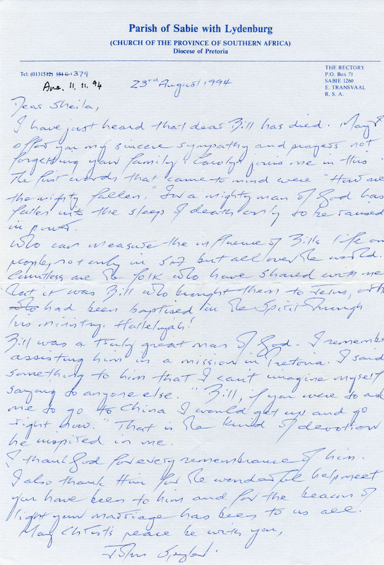 - Letter of condolences, addressed to Sheila Burnett on the death of her husband Bill Bendyshe Burnett, who died on the 23rd of August 1994.