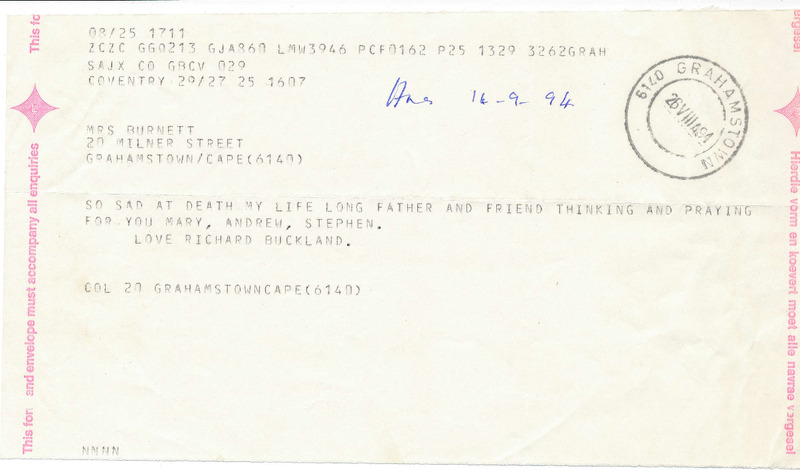Buckland, Richard, “Condolence letter to Sheila Burnett from Richard Buckland”, Cory Library and Historical Archives, accessed 29 December 2025, https://digitalarchives.ru.ac.za/s/cory/item/12305