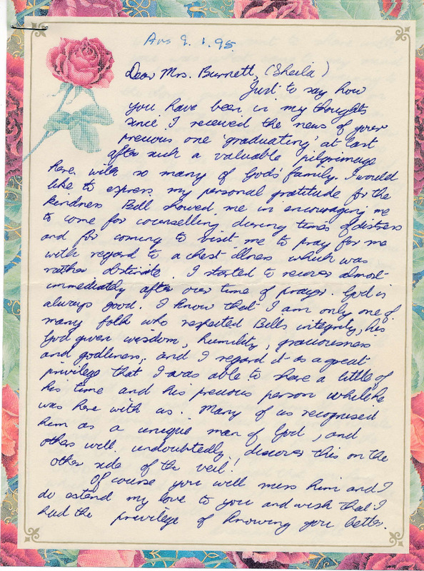 - Letter of condolences, addressed to Sheila Burnett on the death of her husband Bill Bendyshe Burnett, who died on the 23rd of August 1994.