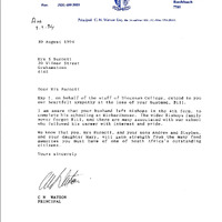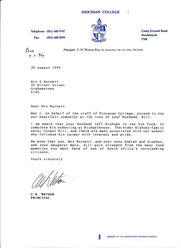 - Letter of condolences, addressed to Sheila Burnett on the death of her husband Bill Bendyshe Burnett, who died on the 23rd of August 1994.