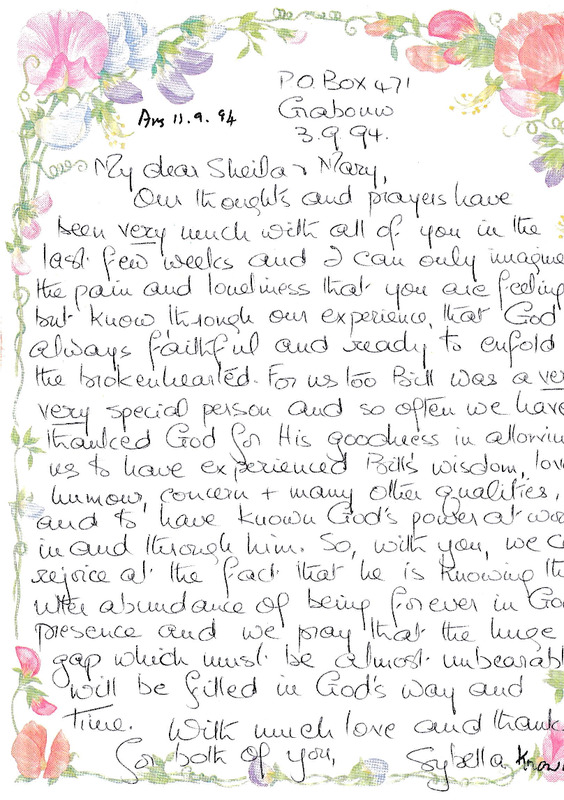 - Letter of condolences, addressed to Sheila Burnett on the death of her husband Bill Bendyshe Burnett, who died on the 23rd of August 1994.