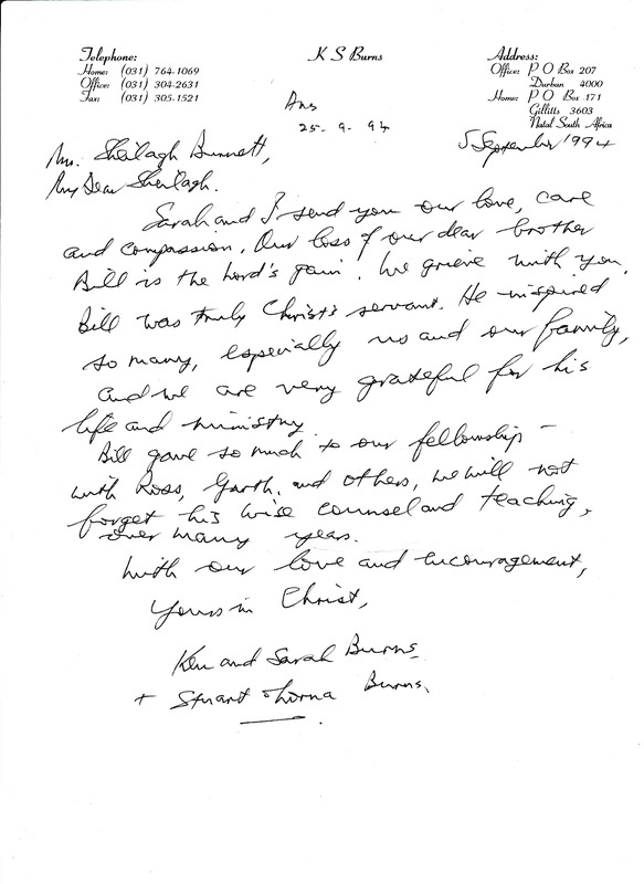 - Letter of condolences, addressed to Sheila Burnett on the death of her husband Bill Bendyshe Burnett, who died on the 23rd of August 1994.