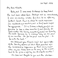 - Letter of condolences, addressed to Sheila Burnett on the death of her husband Bill Bendyshe Burnett, who died on the 23rd of August 1994.