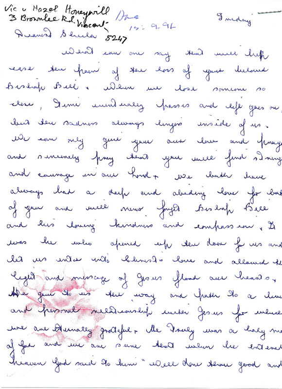 Condolence letter to Sheila Burnett from Vic and Hazel Honeywill
