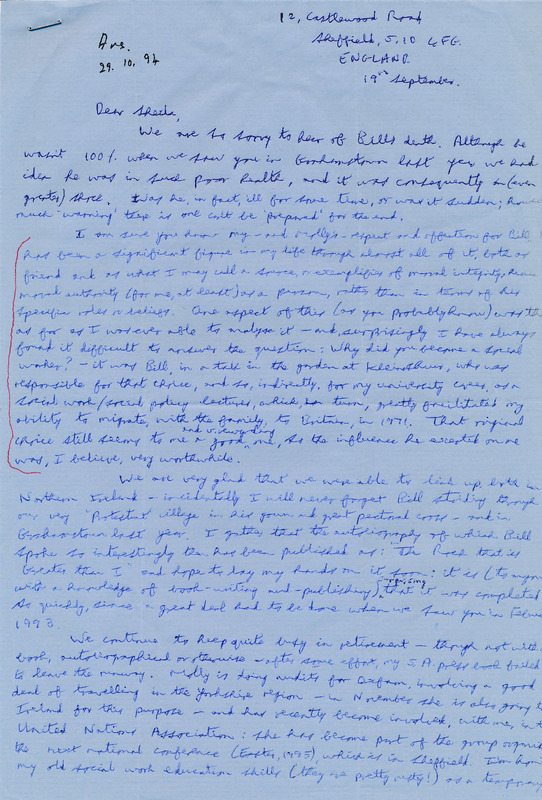 - Letter of condolences, addressed to Sheila Burnett on the death of her husband Bill Bendyshe Burnett, who died on the 23rd of August 1994.