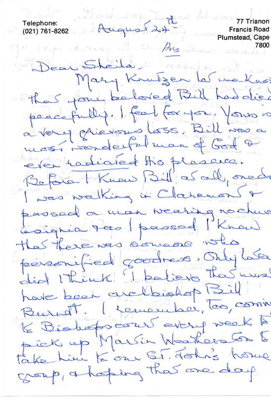 - Letter of condolences, addressed to Sheila Burnett on the death of her husband Bill Bendyshe Burnett, who died on the 23rd of August 1994.
