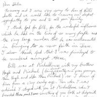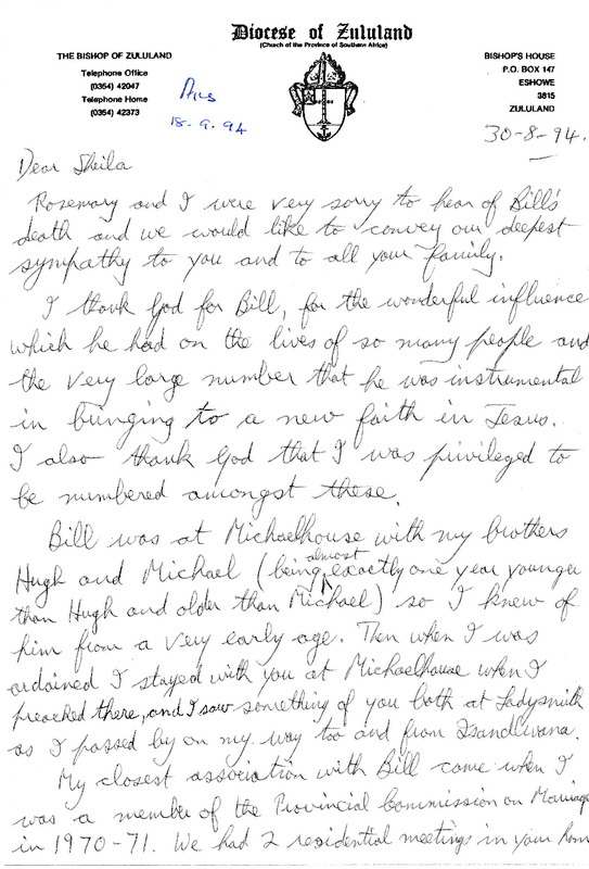 - Letter of condolences, addressed to Sheila Burnett on the death of her husband Bill Bendyshe Burnett, who died on the 23rd of August 1994.