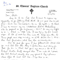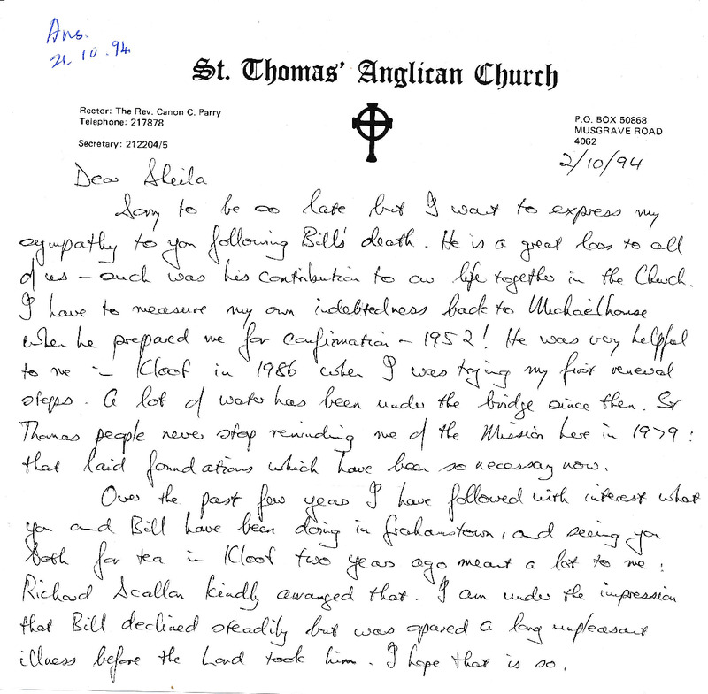 - Letter of condolences, addressed to Sheila Burnett on the death of her husband Bill Bendyshe Burnett, who died on the 23rd of August 1994.