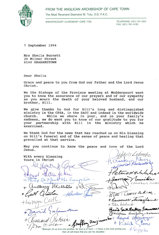 Condolence letter to Sheila Burnett from Rev. Desmond Tutu