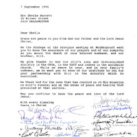 - Letter of condolences, addressed to Sheila Burnett on the death of her husband Bill Bendyshe Burnett, who died on the 23rd of August 1994.
