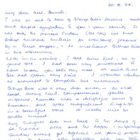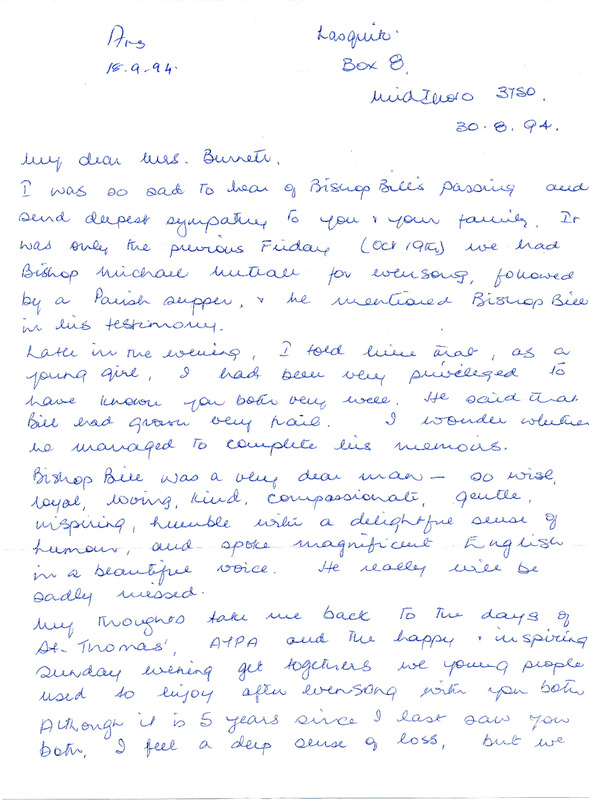 - Letter of condolences, addressed to Sheila Burnett on the death of her husband Bill Bendyshe Burnett, who died on the 23rd of August 1994.