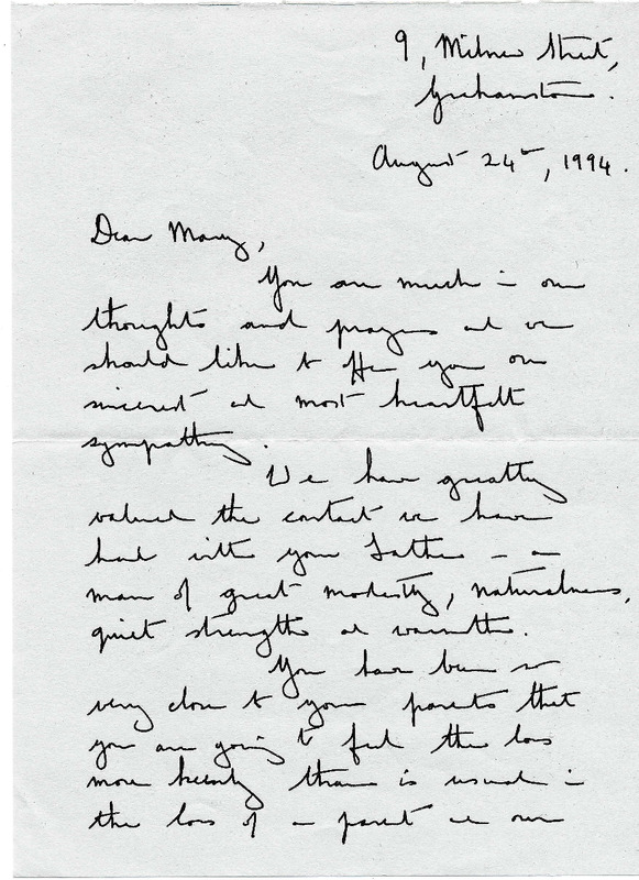 - Letter of condolences, addressed to Sheila Burnett on the death of her husband Bill Bendyshe Burnett, who died on the 23rd of August 1994.