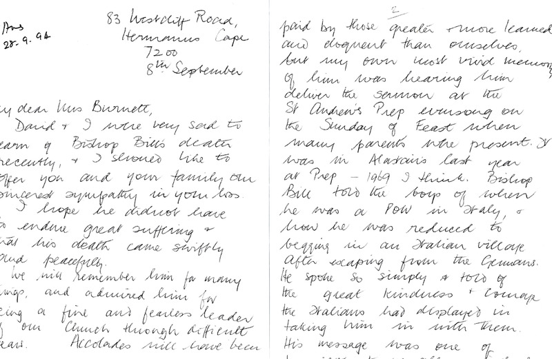 - Letter of condolences, addressed to Sheila Burnett on the death of her husband Bill Bendyshe Burnett, who died on the 23rd of August 1994.