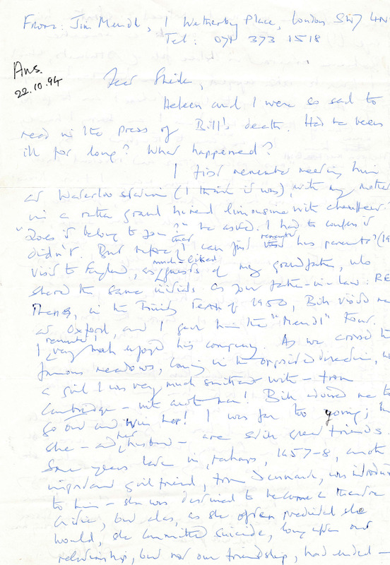 - Letter of condolences, addressed to Sheila Burnett on the death of her husband Bill Bendyshe Burnett, who died on the 23rd of August 1994.