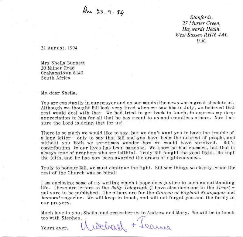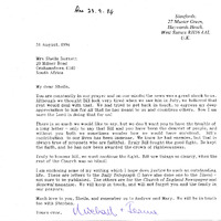 - Letter of condolences, addressed to Sheila Burnett on the death of her husband Bill Bendyshe Burnett, who died on the 23rd of August 1994.