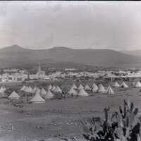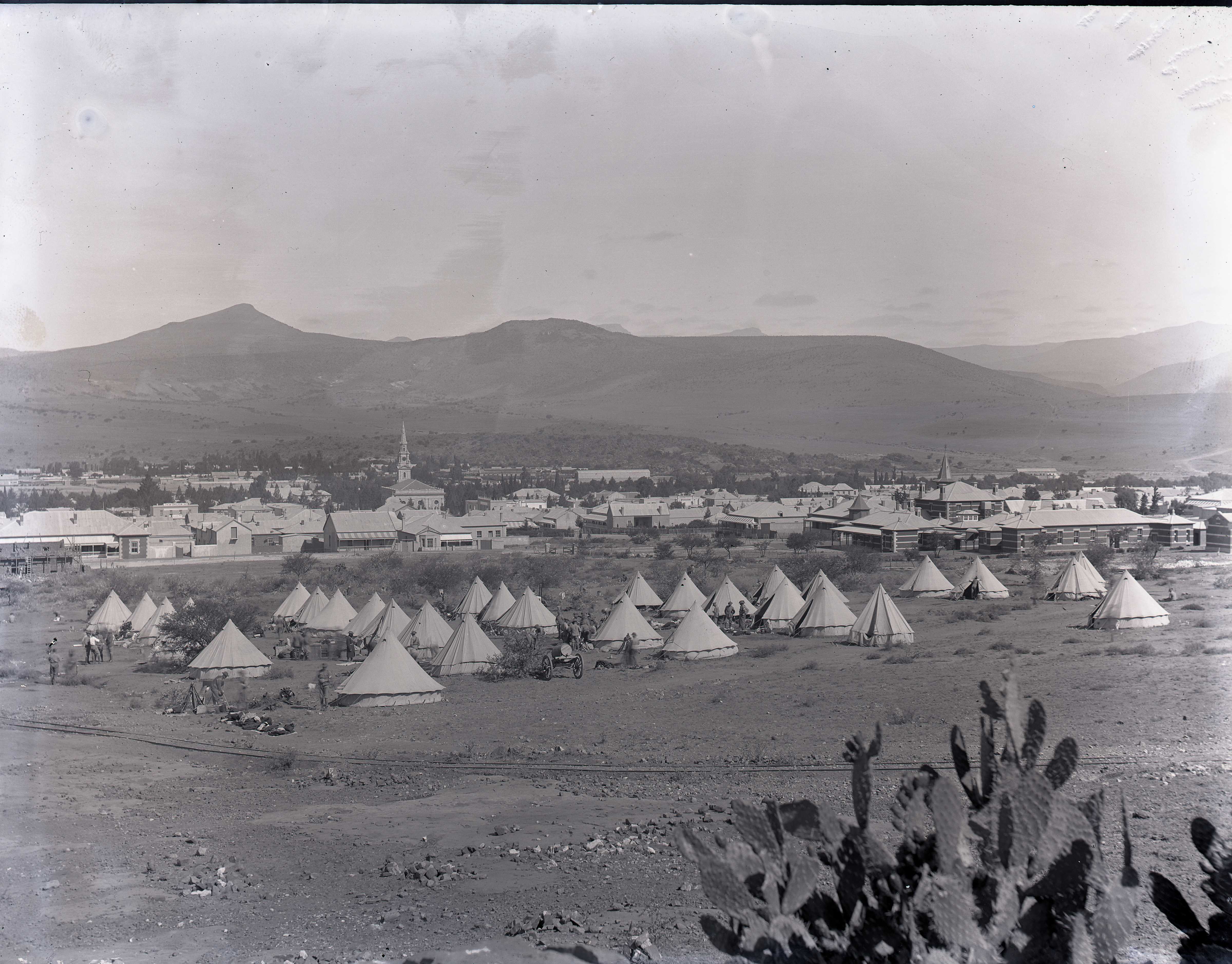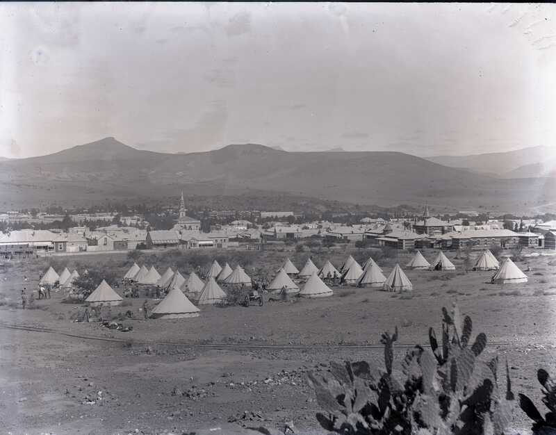 - Glass negative : View showing the camp of First City Regiment with Cradock in the background, December 1899.