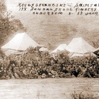 - Handwritten inscription on photo reads: "Krygsgevangene - Bhim Tal - 189-1902 - 175 Sondagskool kinders ouderdom 8-19 jaar".,During the Anglo-Boer War, Bhim Tal POW Camp (India) was one of the Prisoner-or-War (POW) camps used by the British Forces to imprison for Boers from South Africa. Elria Wessels wrote the following as a caption to the image, on the Facebook group “Bhim Tal POW Camp: Bhim Tal is the largest lake located in the Kumaon Hills in the Uttaranchal province. The lake is 1701 m by 454 m, making it 265 m longer than Naini Lake. The Boer camp was established at the northern most point of the lake. Situated at a level of 1371.6 m, it is twenty-two km from Nainital. The lake regulates the climate of the area. The weather is very pleasant throughout the year except during winter months. In the summer the temperature alternates between 27.5°C and 11°C and 16°C and 2°C in winter. It rains almost every afternoon and Rev. A Burger recorded that he found the camp under water after a heavy rainstorm on 21 May 1902. The 500 prisoners of war, mostly children, and the aged were housed in tents in a picturesque setting -“absolutely beautiful” according to Burger. He came to the conclusion that even the most beautiful of settings would not ever be satisfying to a POW as it was not the scenery of his beloved fatherland. Major A. de G. Hadow and Captain T.C.B. Holland were in charge. They were assisted by 2nd Lt. B. H. Hall (2nd Yorkshire Regiment); 2nd Lt. L. Lovett Thomas (Royal Engineers), Lt. F. Curtis (2nd Yorkshire Regiment) and Lt. N.E. Swan (2nd Yorkshire Regiment) adjutant and quartermaster. The camp commandant was Lt. C.F. Colquhoun (1st Surrey Regiment) while the section officer was Lt. H.J. Massey (3rd Rifle Brigade). J.F. Ferris acted both as censor and interpreter. The camp finally closed its door on 1 December 1902.”