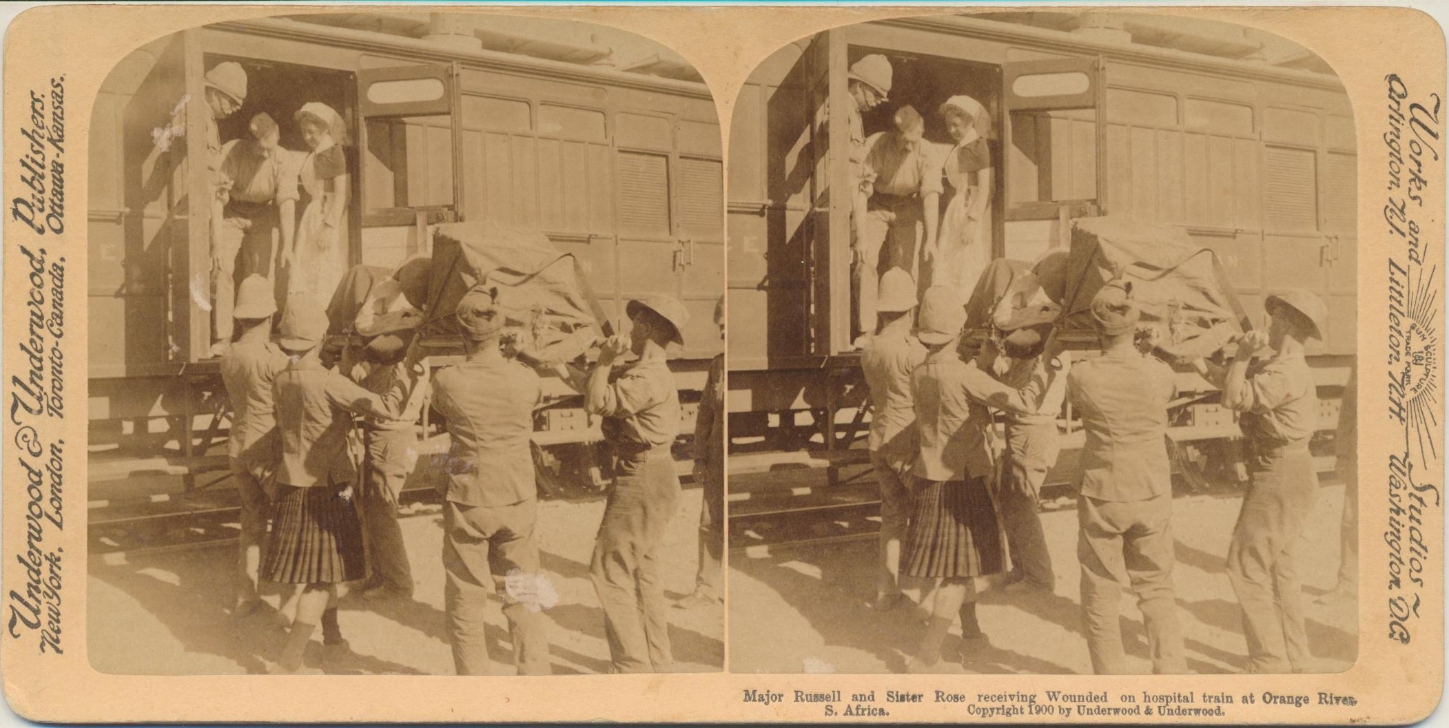 Unattributed, “Major Russell and Sister Rose receiving wounded on hospital train at Orange River”, Cory Library and Historical Archives, accessed 28 December 2025, https://digitalarchives.ru.ac.za/s/cory/item/12763