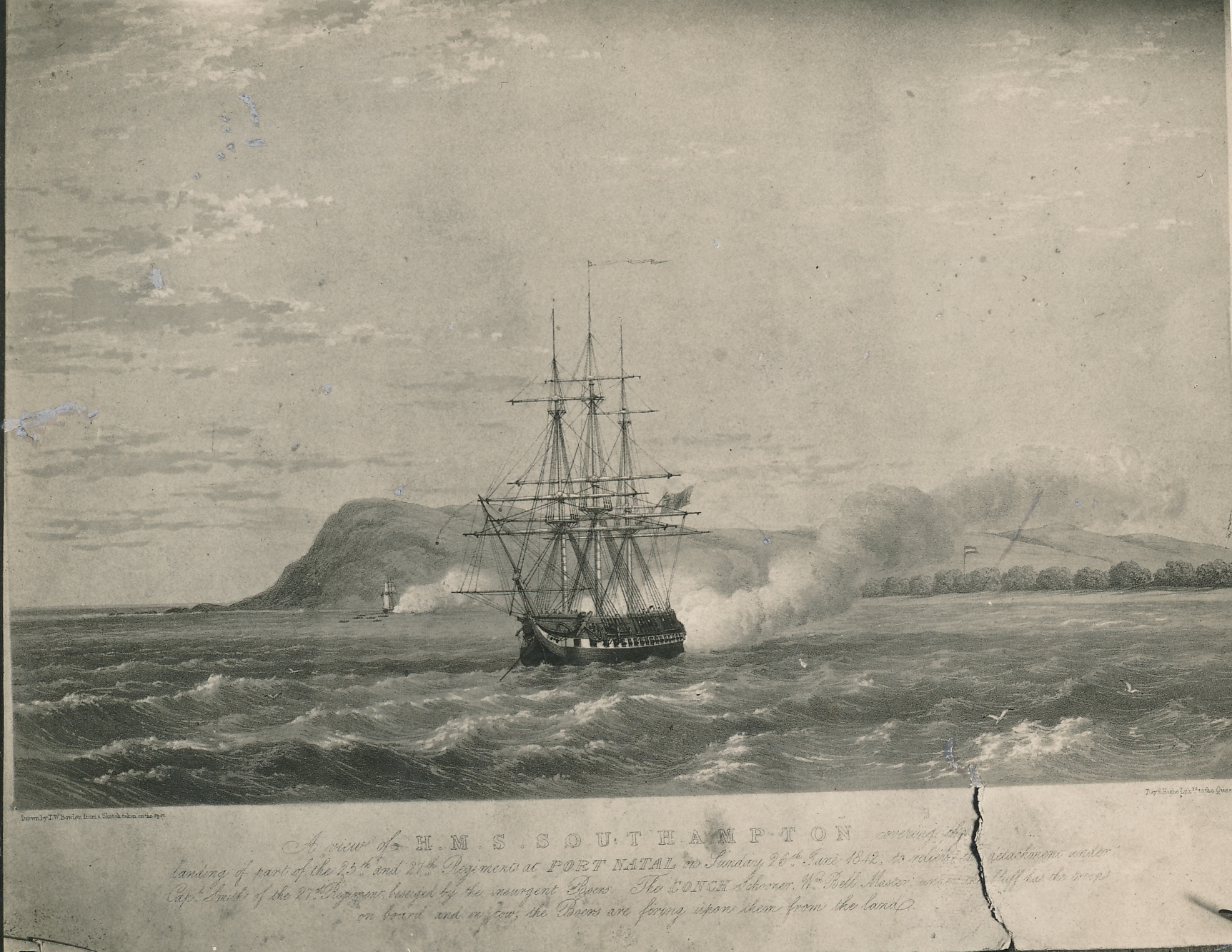 - The note at the bottom reads: “A view of HMS Southampton covering the landing the landing of troops at Port Natal”,HMS Southampton, Port Natal, 1842.