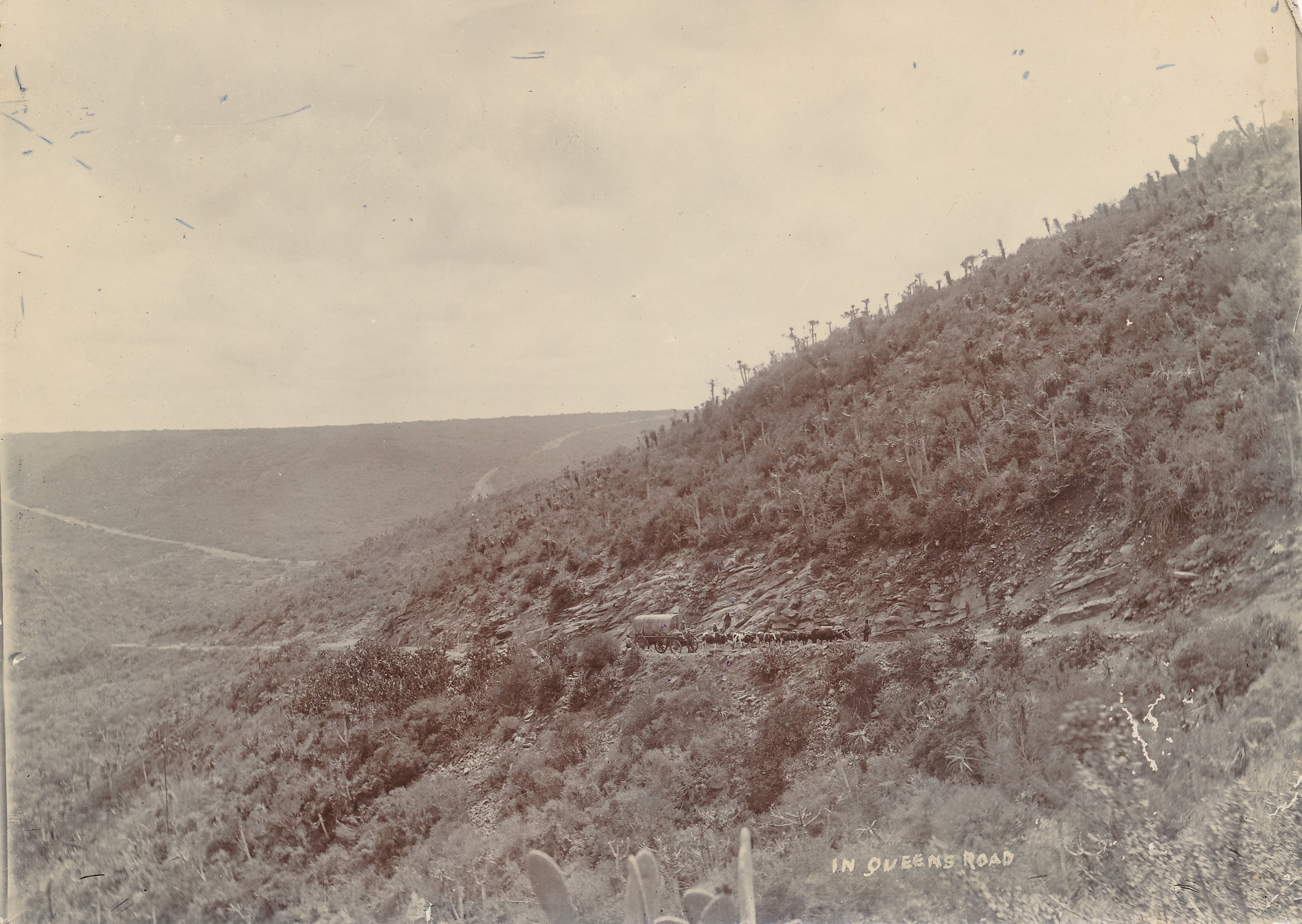 - Photograph of a wagon being pulled by several oxen. A note in the bottom right corner reads: “In Queens Road”