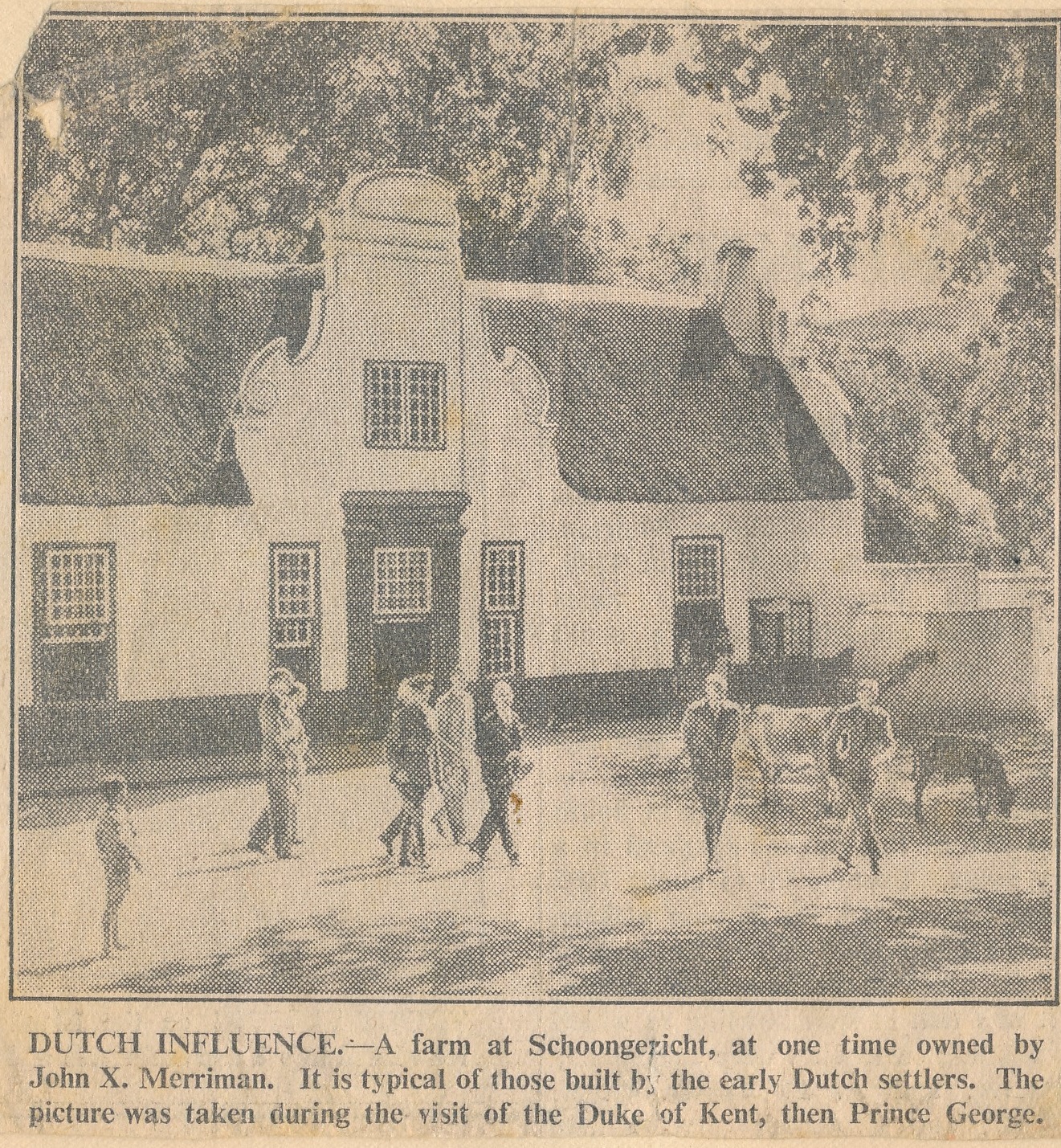 - Newspaper article/snippet: "Dutch influence.-A farm Schoongezight, at one time owned by John X. Merriman. It is typial of those built by the early Dutch Settlers. The picture was taken during the visit of the Duke of Kent, then Prince George."