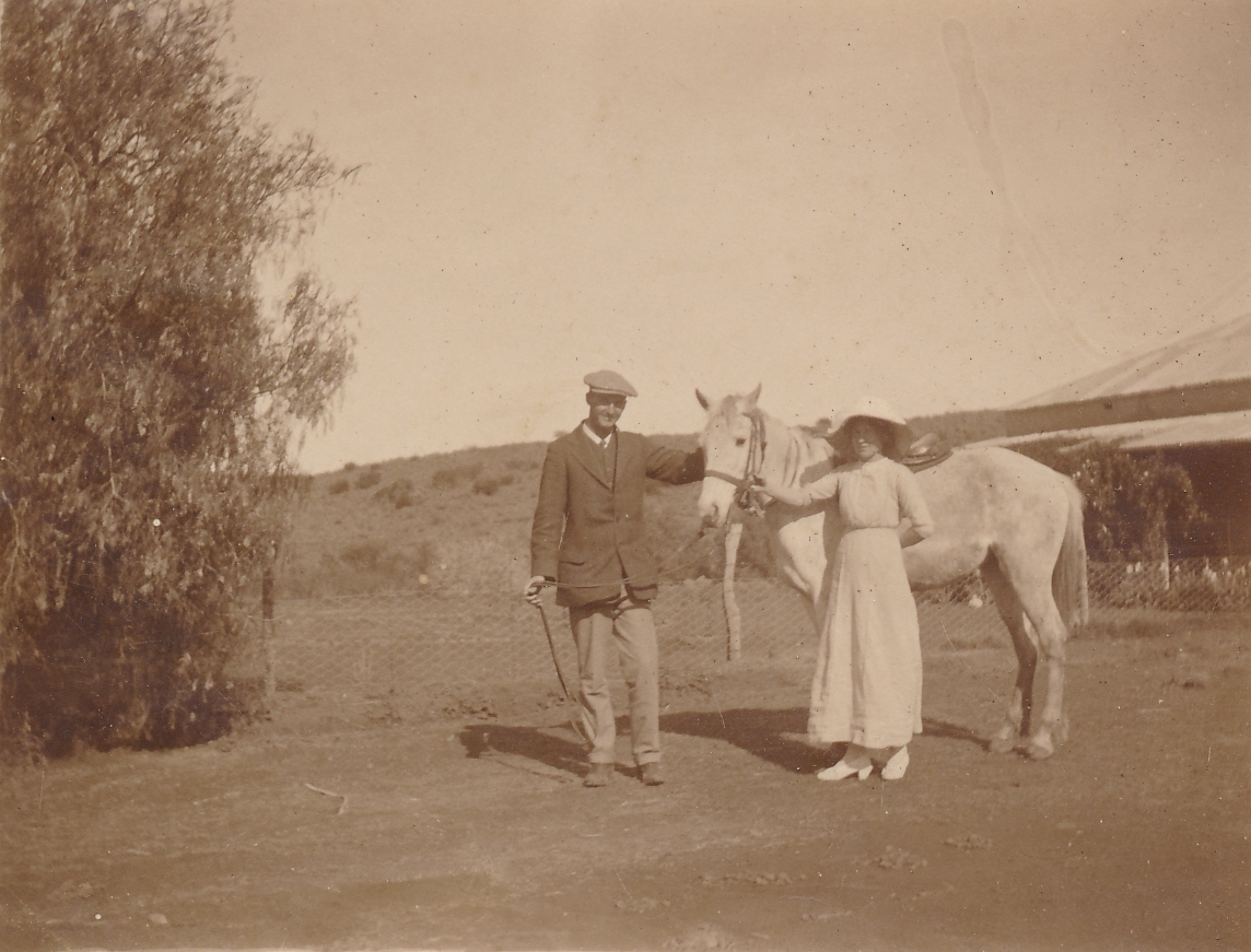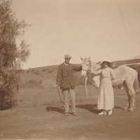- Photograph of a man with a woman standing next to the horse perhaps for a ride