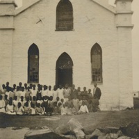 - Photograph shows a group of black children (possibly a school class) with their schoolmaster in front of the church building. Inscribed on the back are the words ' ... This picture was taken 1935 aprox by Allan Biggs when he took his mother to see the church built by her father.' Photo accompanied a memorial sketch of Benjamin F. Roberts, kept at MS 19 922.
