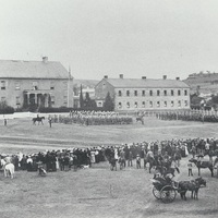 - View of a military parade on the Drostdy grounds, Grahamstown, ca. 1895, with a crowd of spectators and carriages in the foreground