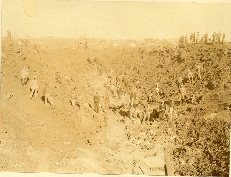 - Photograph showing men standing in and around a crater left by the Braamfontein dynamite explosion which occurred on 19 February 1896.