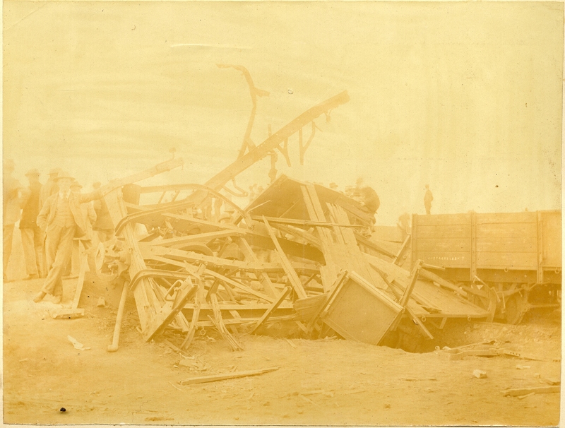 - Photograph showing several men standing around railway carriages which were destroyed by the Braamfontein dynamite explosion which occurred on 19 February 1896.