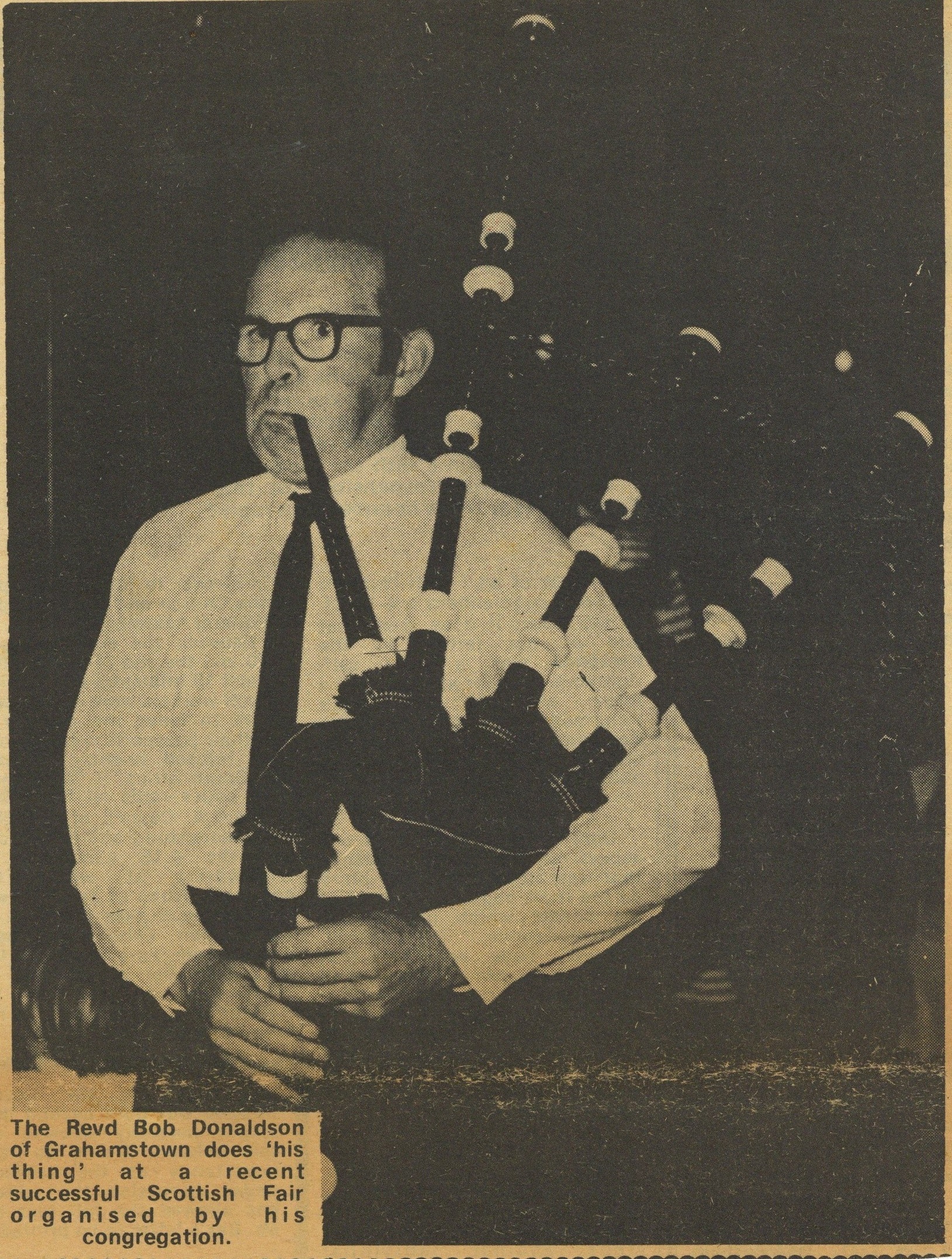 Unattributed, “Press clipping: The Rev. Bob Donaldson of Grahamstown doing his thing at a Scottish Fair Organised by congregation”, Cory Library and Historical Archives, accessed 28 December 2025, https://digitalarchives.ru.ac.za/s/cory/item/13789