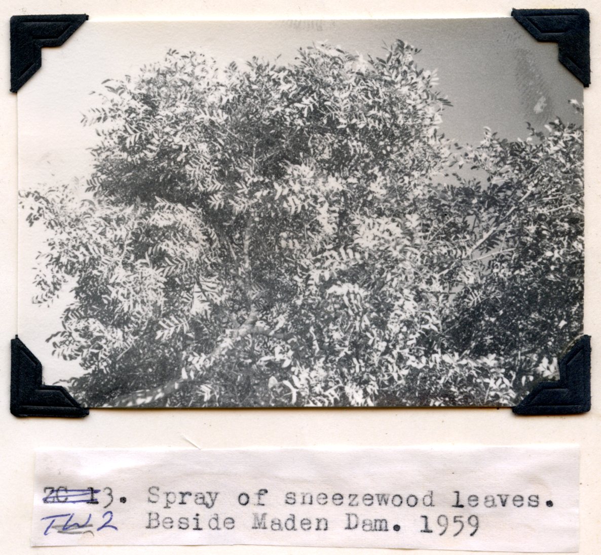 - Caption "Spray of sneezewood leaves. Beside Maden Dam. 1959.”