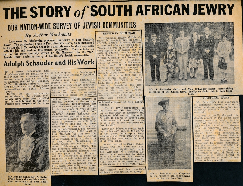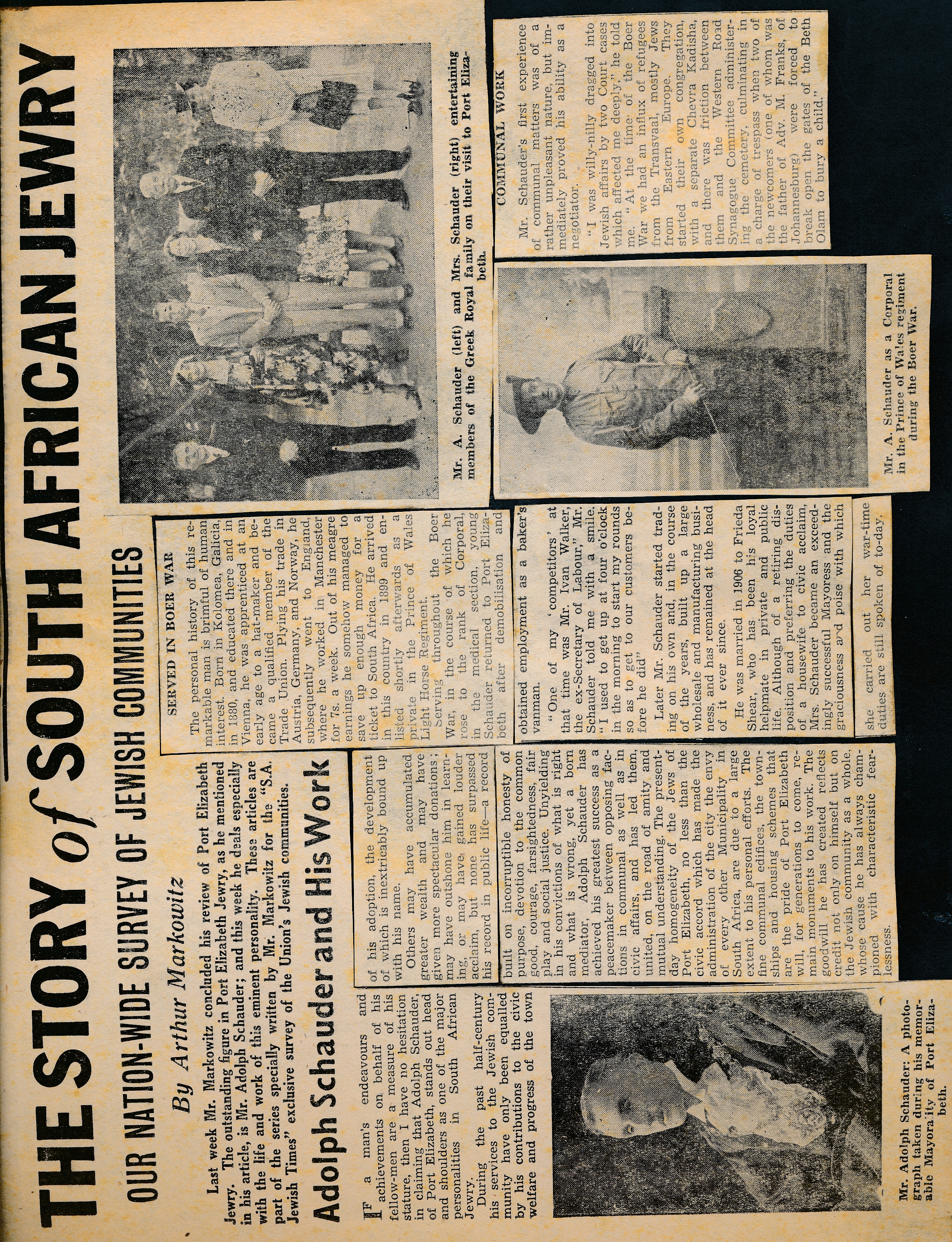 - Caption reads: "As the champion of the under-priviledged Mr. Shcauder has done his most meritious work in Port Elizabeth"