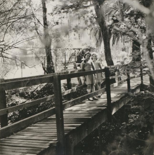 - Photograph of two young girls (possibly Ann and Elizabeth Kerr) on a wooden bridge over Kowie Ditch in the Grahamstown Botanical Gardens,Leila Kerr (Linington) (Donor)