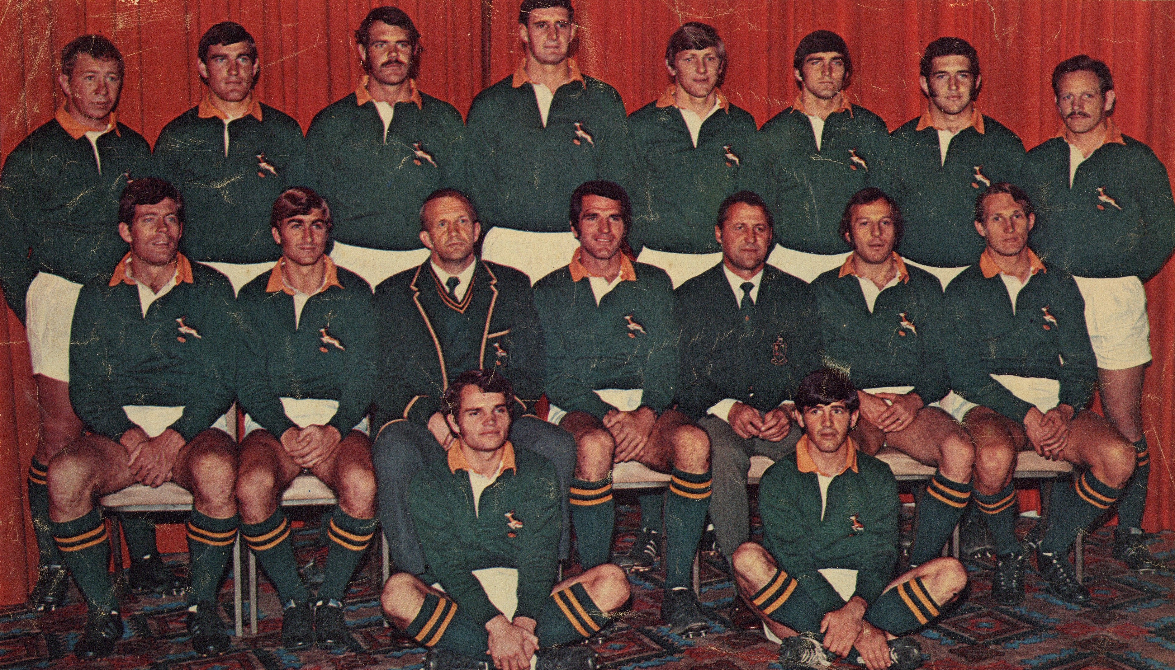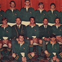 - Springboks England v Ellispark Team, Team photograph with rugby players wearing Springbok uniform (white shorts, green jersey with Springbok insignia, green socks with yellow stripes), Group photograph, Colour photograph, Indoor photograph, Two men sitting have formal clothes on, blazers green and bearing the Springbok insignia, Players standing have arms behind their backs, Players sitting have arms in their laps, Agter: Theo Sauerman, Joggie Jansen, Piet du Plessis, John Williams, Albie Bates, Ray Carlson, Niek Bezuidenhout, Piston van Wyk, Middel: Jan Ellis, Tonie Roux, Mnr Johan Claasen, Piet Greyling, Mnr Jannie le Roux, Syd Nomis, Gert Muller, Voor: Dawie Snyman, Joggie Viljoen.