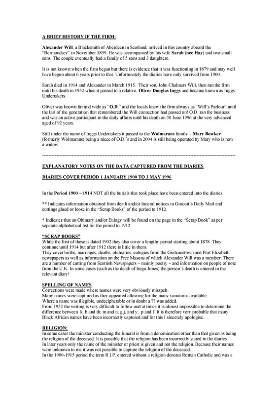 - A BRIEF HISTORY IF THE FIRM: Alexander Will, a Blacksmith of Aberdeen in Scotland, arrived in this country aboard the “Bermondsey” in November 1859. He was accompanied by his wife Sarah (nee Hay) and two small sons. The couple eventually had a family of 5 sons and 3 daughters. It is not known when the firm began but there is evidence that it was functioning in 1879 and may well have begun about 6 years prior to that. Unfortunately the diaries have only survived from 1900. Sarah died in 1914 and Alexander in March 1915. Their son, John Chalmers Will, then ran the firm until his death in 1952 when it passed to a relative, Oliver Douglas Inggs and became known as Inggs Undertakers. Oliver was known far and wide as “O.D.” and the locals knew the firm always as “Will’s Parlour” until the last of the generation that remembered the Will connection had passed on! O.D. ran the business and was an active participant in the daily affairs until his death on 30 June 1996 at the very advanced aged of 92 years. Still under the name of Inggs Undertakers it passed to the Wolmarans family – Mary Bowker (formerly Wolmarans) being a niece of O.D.’s and in 2004 is still being operated by Mary who is now a widow.