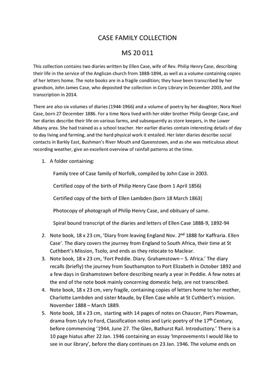 - This collection contains two diaries written by Ellen Case, wife of Rev. Philip Henry Case, describing their life in the service of the Anglican church from 1888-1894, as well as a volume containing copies of her letters home. The note books are in a fragile condition; they have been transcribed by her grandson, John James Case, who deposited the collection in Cory Library in December 2003, and the transcription in 2014. There are also six volumes of diaries (1944-1966) and a volume of poetry by her daughter, Nora Noel Case, born 27 December 1886. For a time Nora lived with her older brother Philip George Case, and her diaries describe their life on various farms, and subsequently as store keepers, in the Lower Albany area. She had trained as a school teacher. Her earlier diaries contain interesting details of day to day living and farming, and the hard physical work it entailed. Her later diaries describe social contacts in Barkly East, Bushman’s River Mouth and Queenstown, and as she was meticulous about recording weather, give an excellent overview of rainfall patterns at the time.