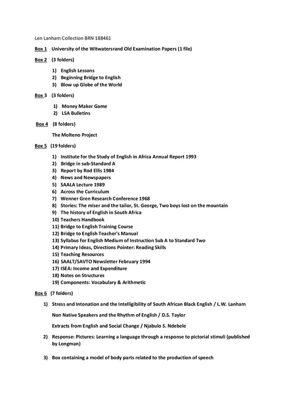 - Papers of Len Lanham, relating to the teaching of Linguistics and the the teaching of Reading and Writing. Includes materials relating to the Molteno Project