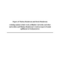 - The Henderson Papers comprise archival documents that were collected over the years by Dr. Thelma Muriel Henderson (1933 – 2009) and her husband Dr. Derek Scott Henderson (1929 – 2009) and relate to their involvement in University administration in the United States of America and South Africa. The bulk of the collection relates to their work at Rhodes University and in particular Thelma Henderson’s extensive work in social upliftment in Grahamstown. The collection is divided into series, namely: 1) Speeches delivered by Thelma Henderson and Derek Henderson, 2) Thelma Henderson’s Master’s degree Social Development: Theory, Practice and Evaluation, 3) Records relating to the management of St. Peter Clavers Nursery School (formerly known as Fingo Village Nursery School).