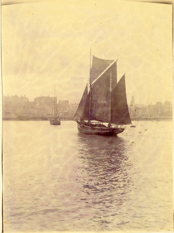 - Photograph of a boat sailing on a lake. Printed on the sail is S.M59.