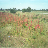 - Watsonia pillansii, past their best at the end of flowering season. Part of a large field to the left. This field due to be covered by urban development.