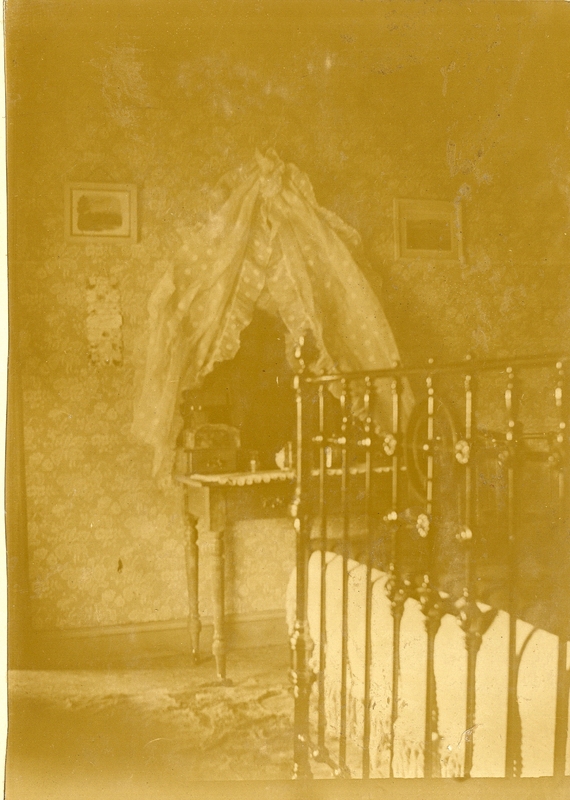 - Photograph of the interior of a house (presumably in a mining town) showing the foot of a bed and a dressing table with a draped mirror in a bedroom.,Gold Fields of South Africa Ltd. (Donor)