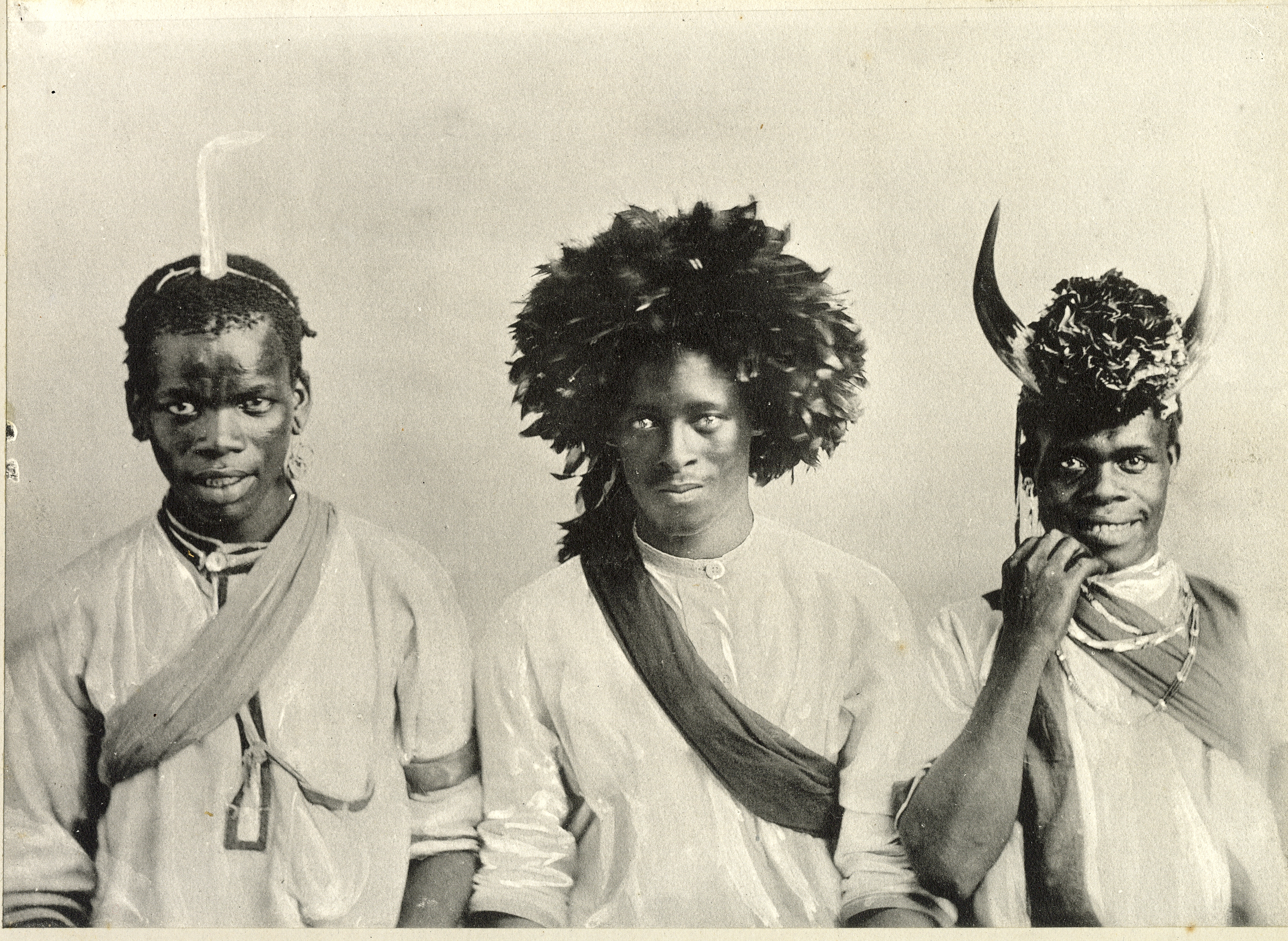 - A photo of three Zulu rickshaw men wearing their ornamented headgear.