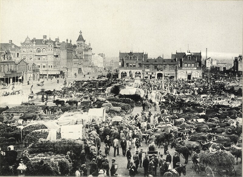 - The early morning produce market, showing the enormous number of wagons and oxen used to convey 'supplies' to the important centre, Johannesburg.