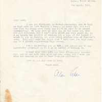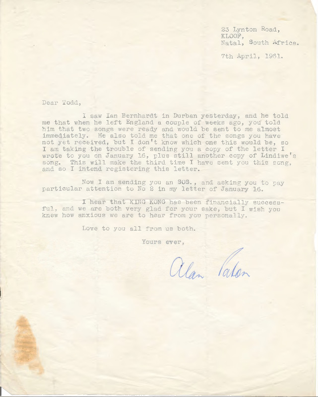 Letter from Alan Paton to Todd Matshikiza, dated 7 April 1961