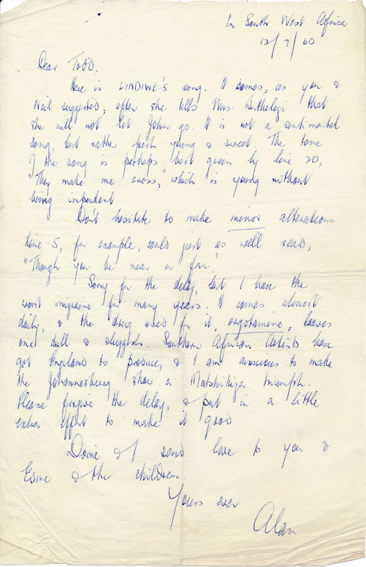 - The letter, dated the 12 July 1960, sent to Todd Matshikiza by Alan Paton, includes a discussion about 'Lindiwe's song', which would appear in the musical 'Mkhumane'. 'Mkhumane' was a three-act musical that opened on the 29th of March 1960 at the Durban City Hall, with the lyrics written by Alan Paton and the music composed by Todd Matshikiza.