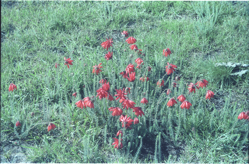 - Dense patch of Erica cerinthoides en masse after recent burn. Several similar patches in the area. Fresh grass just sprouting. Soon to disappear under urban sprawl.